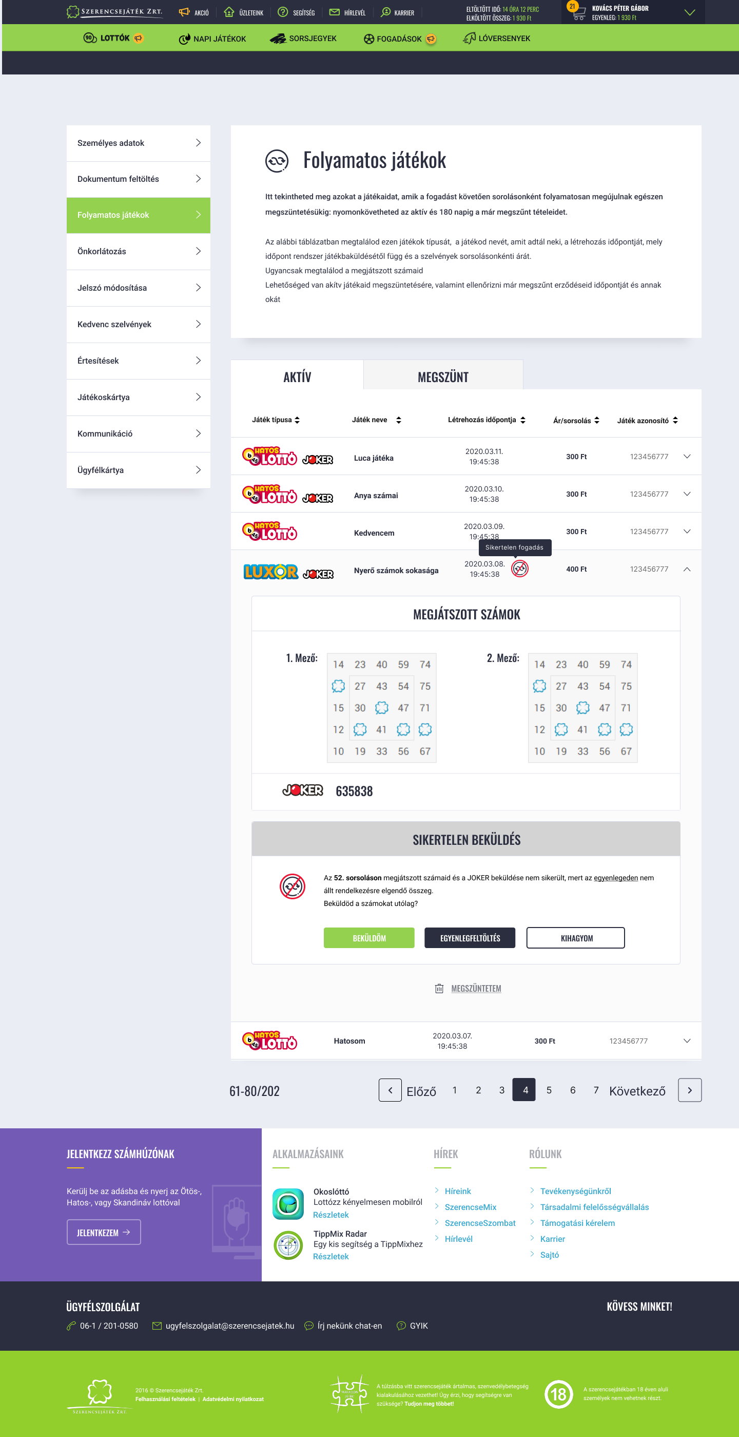 Sikertelen teljesítés esetén (pl. a belső egyenleg terhére történő részvételi díj megfizetése bármely oknál fogva nem érvényesíthető) a játékos az SzZrt. internetes játék és fogadási oldalán történő soron következő bejelentkezését követően értesítést kap, illetve az SzZrt erről haladéktalanul e-mail útján értesíti a játékost, a sikertelen játékba küldés az érintett folyamatos játéknál is megjelenítésre kerül. Sikertelen teljesítés esetén a játékosnak lehetősége van arra, hogy az érintett alapjátékot manuálisan játékba küldje.