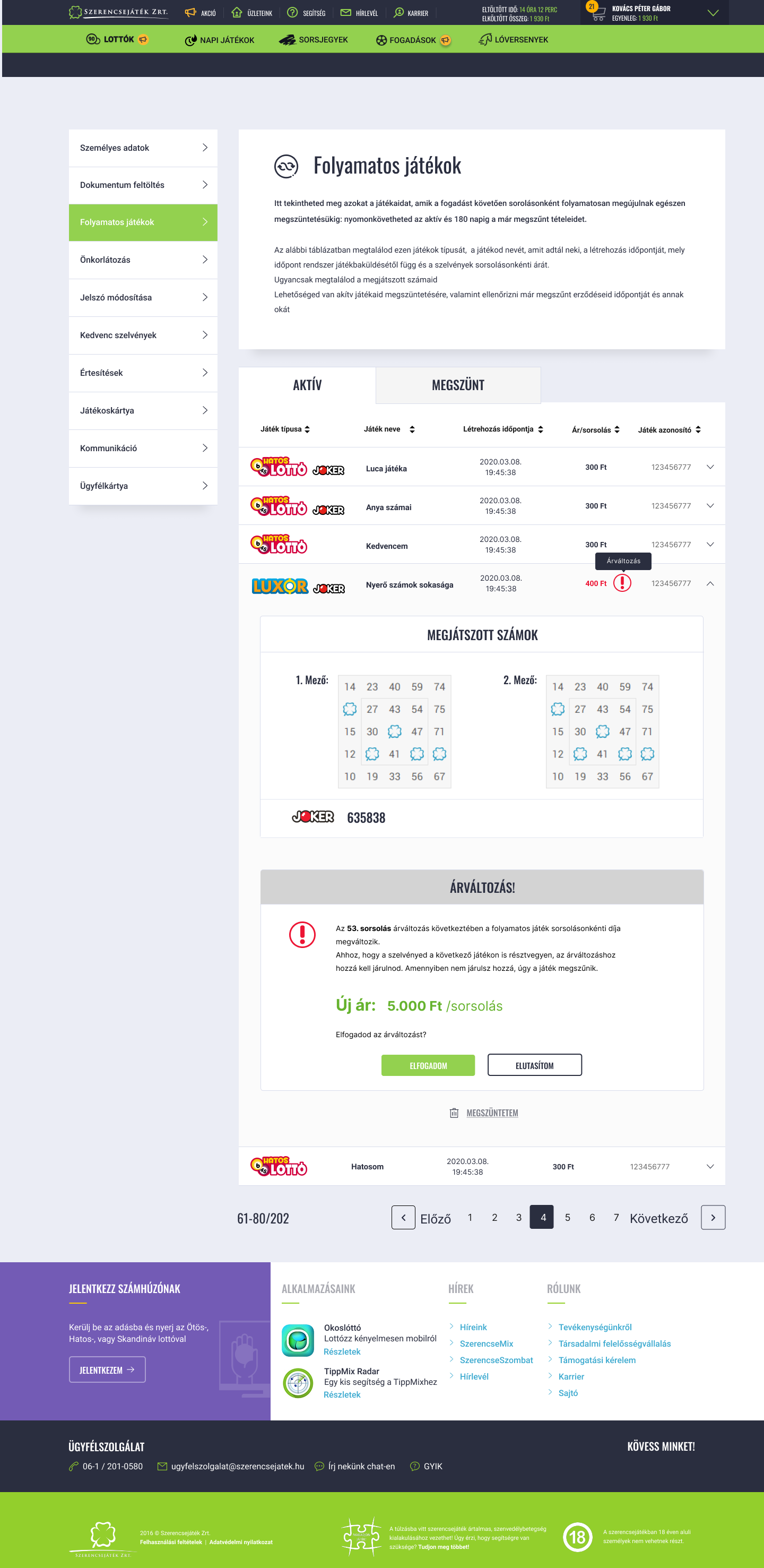 Ha több olyan folyamatos játékod is van, amelyet érint az árváltozás, akkor az új ár elfogadását mindegyik érintett folyamatos játékra külön kell megtenned! (Pl. ha 2 db Ötöslottó folyamatos játékod van, akkor az Ötöslottó árának változásakor mind a kettőnél külön-külön kell elfogadnod az adott folyamatos játék új árát.)