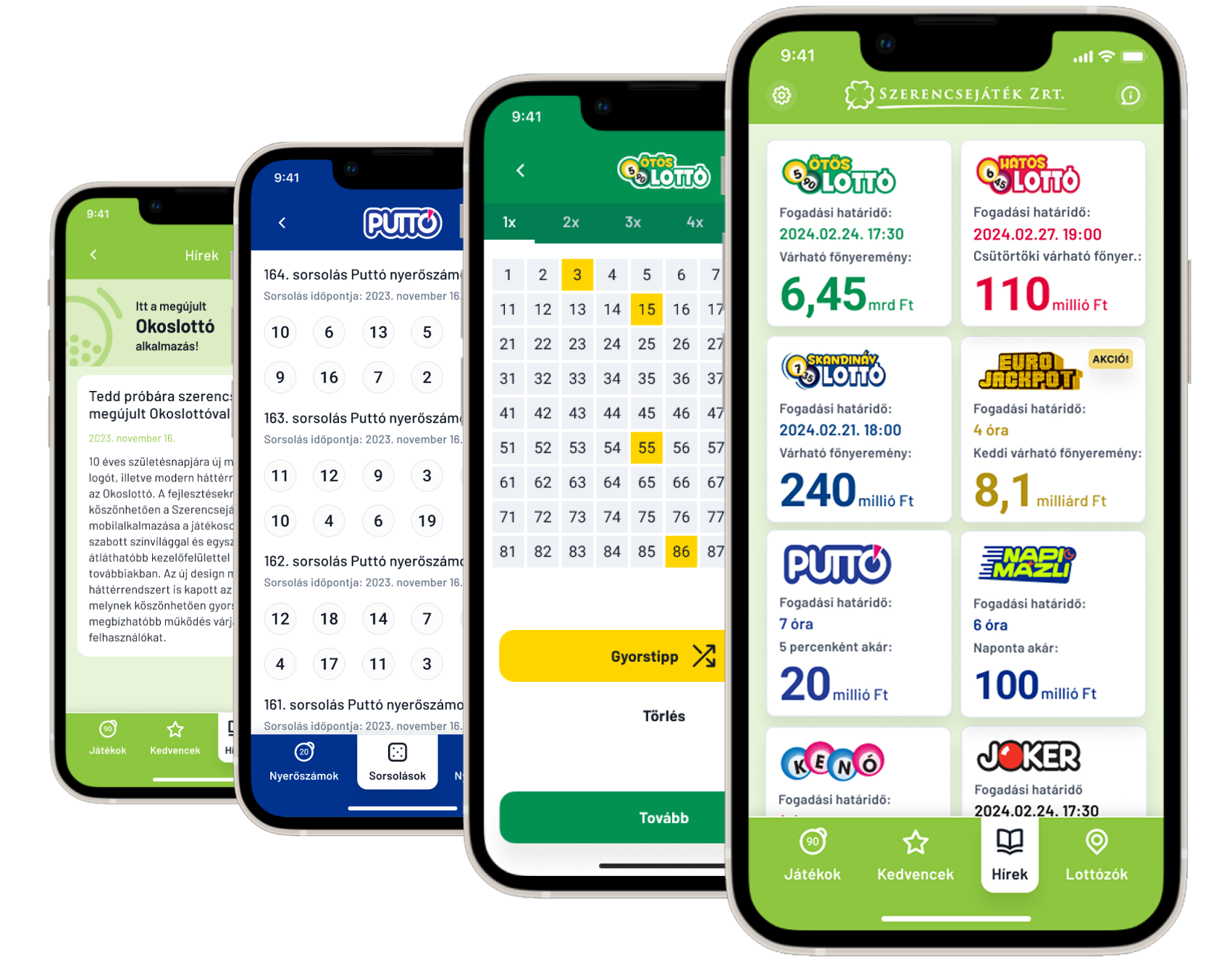 Az alkalmazásban jelenleg az Ötöslottó, a Hatoslottó, a Skandináv lottó, az Eurojackpot, a Puttó, a Kenó, a Napi Mázli és a Joker játékaink érhetőek el.